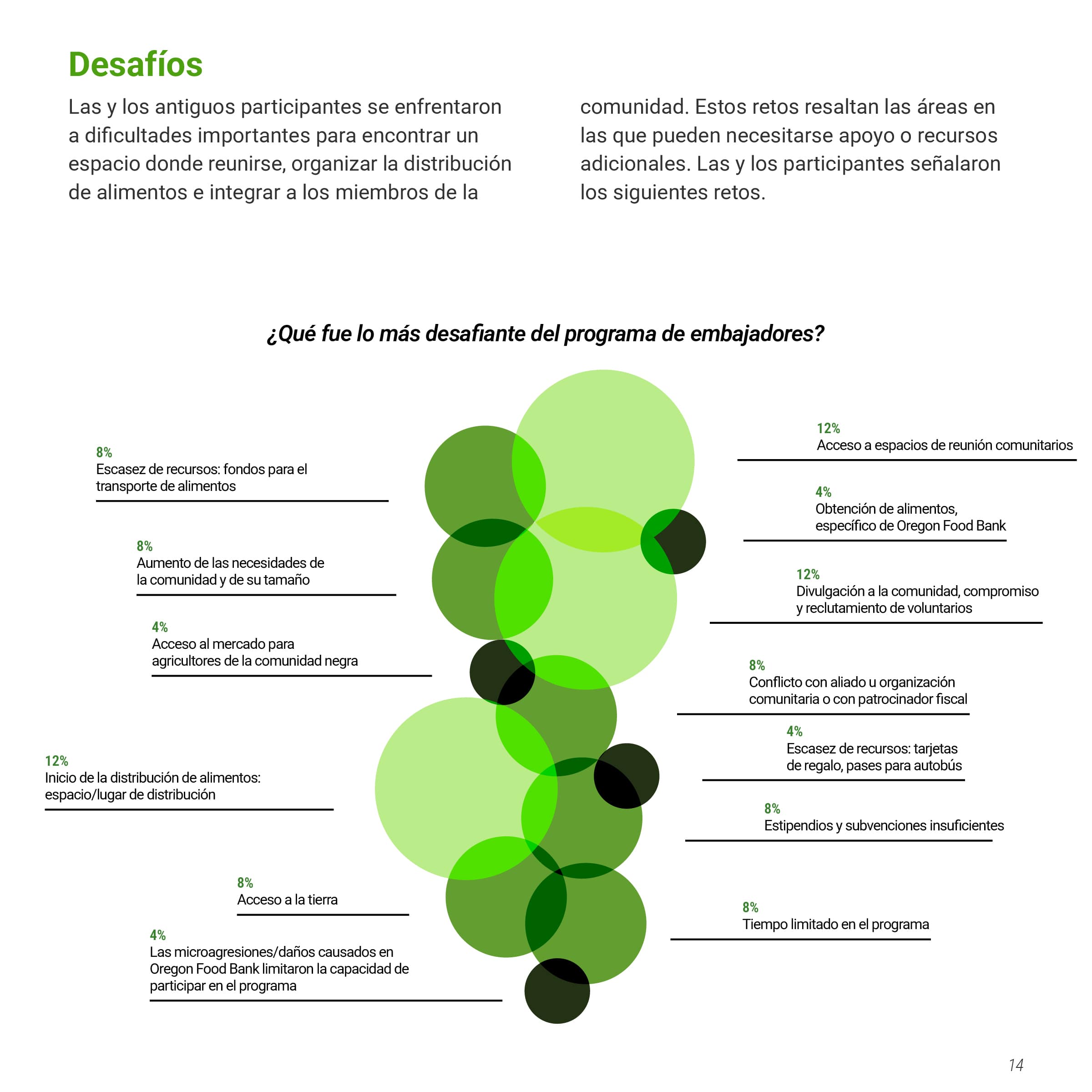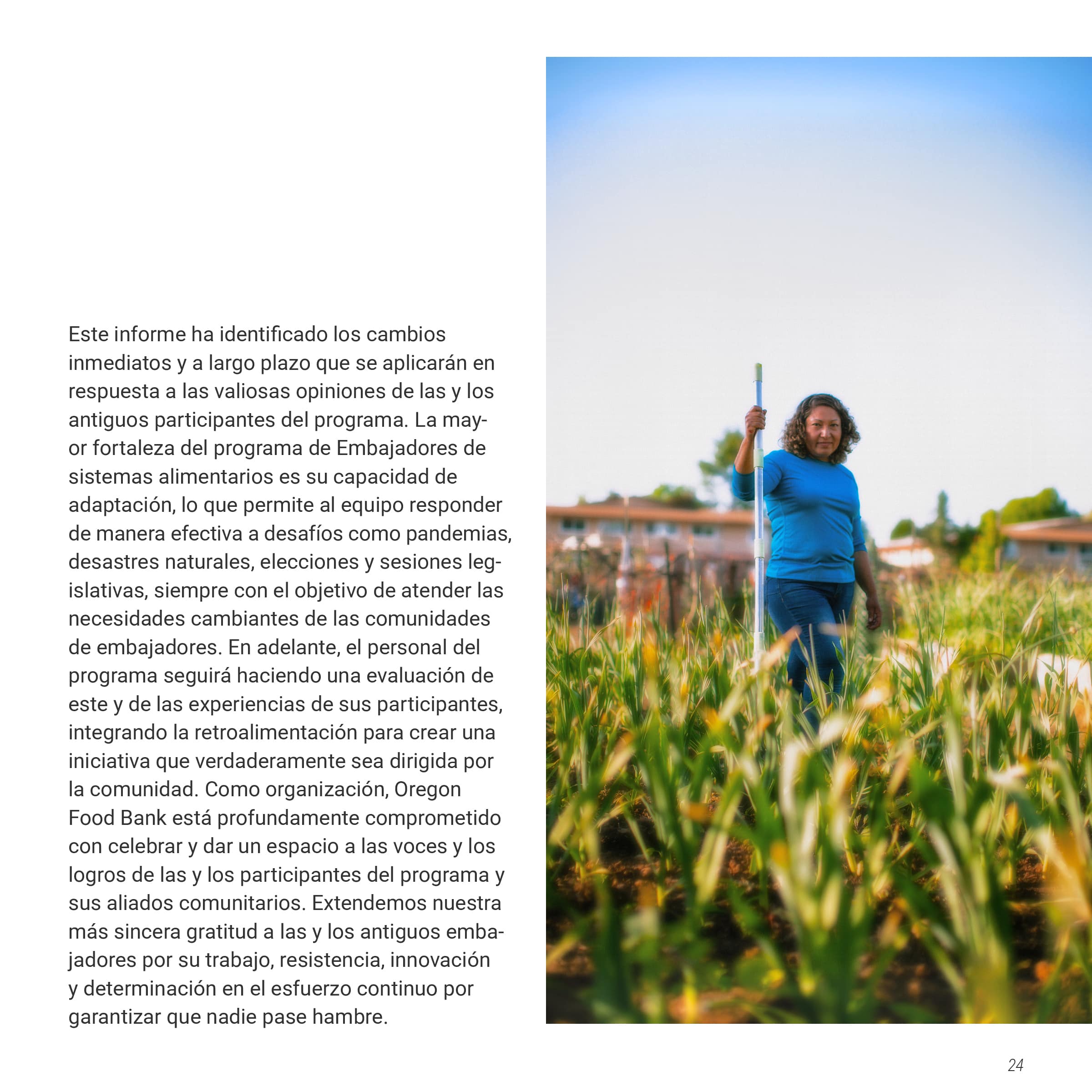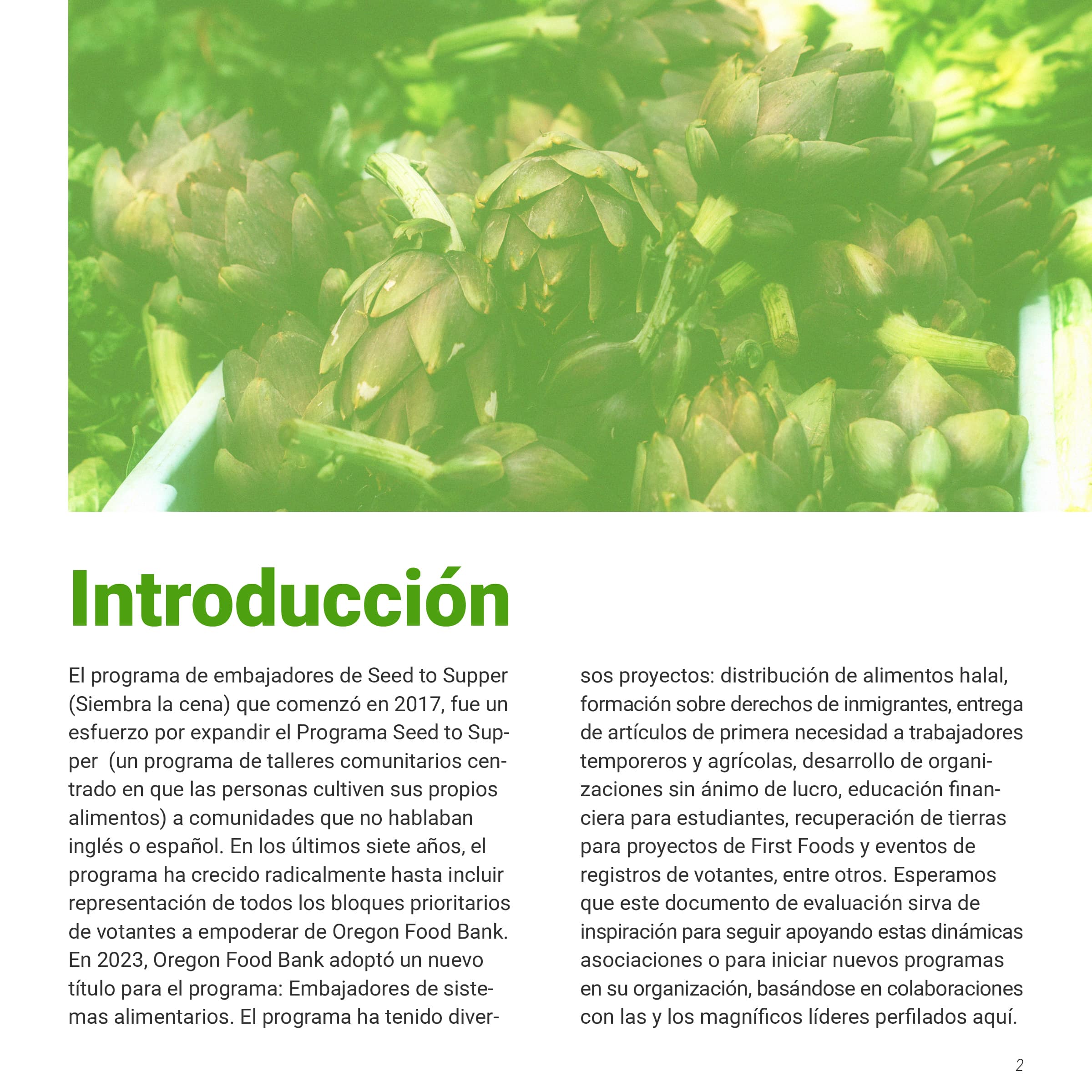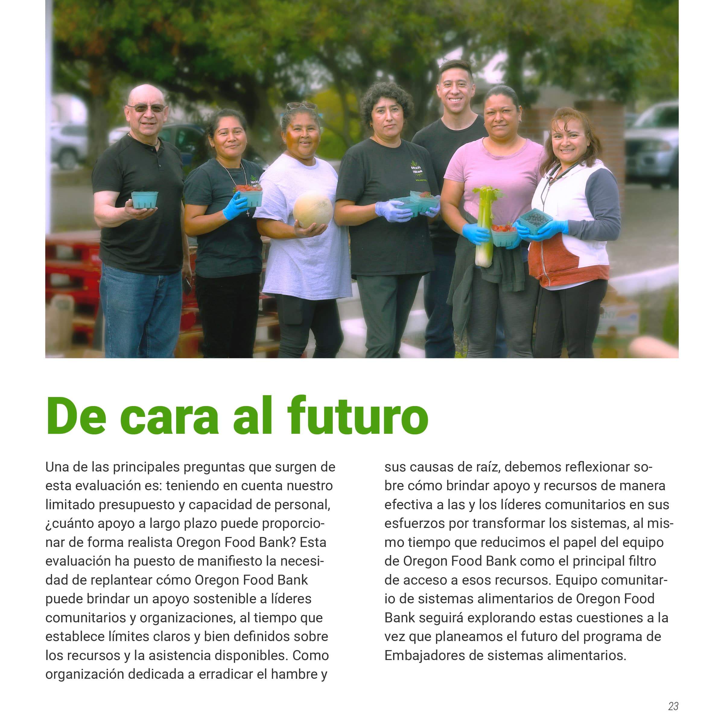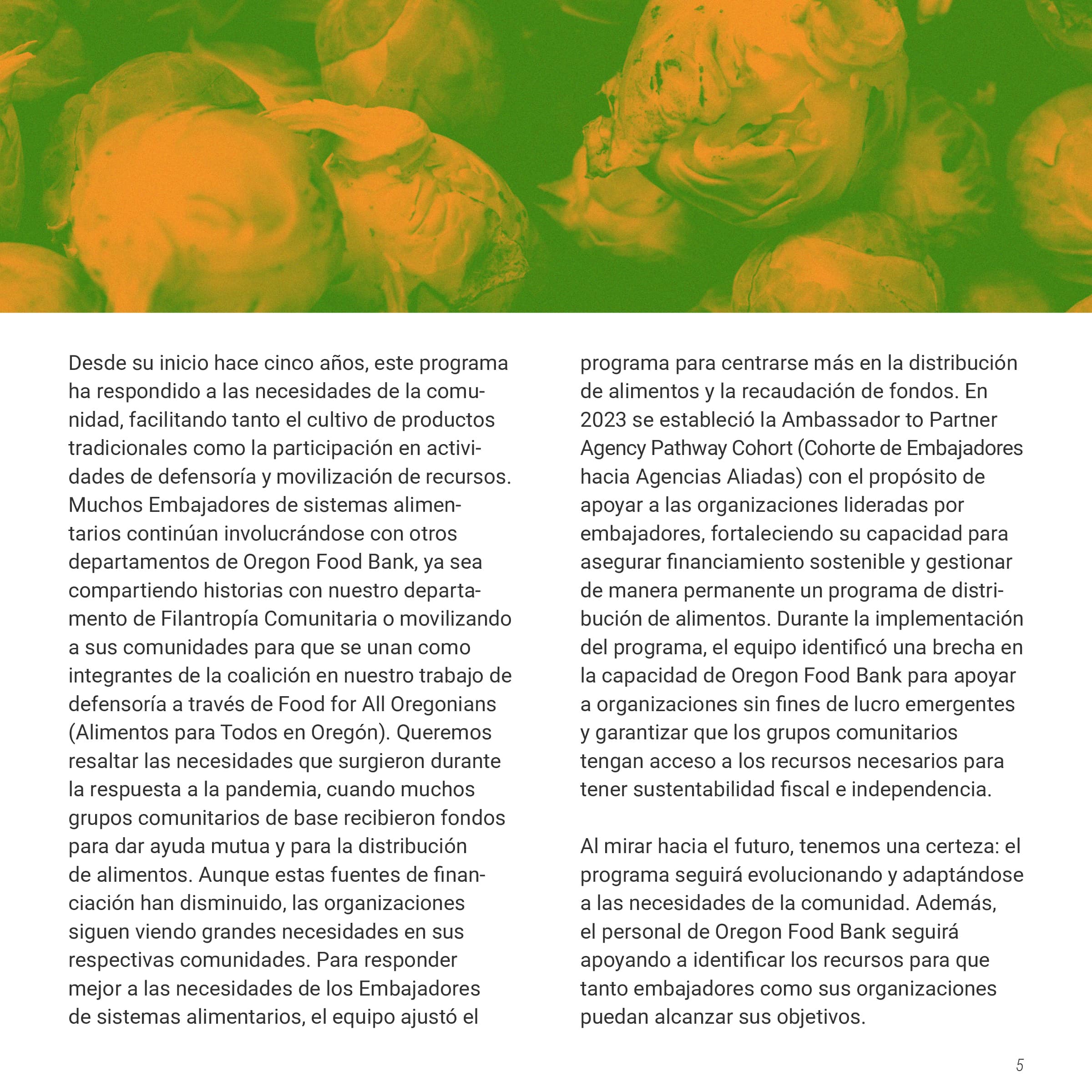 I was tasked with creating a multi-page document of the Oregon Food Bank’s Food Systems Ambassador Program, a program that helped local BIPOC residents become “ambassadors” in their community, teaching them skills to increase food security. This document would showcase both the program's successes and areas for improvement, persuading other nonprofits to implement similar community-serving initiatives. The document needed to be produced in both English and Spanish while maintaining their established brand identity. I was also asked to design graphs and charts to communicate data collected from the ambassador’s feedback.