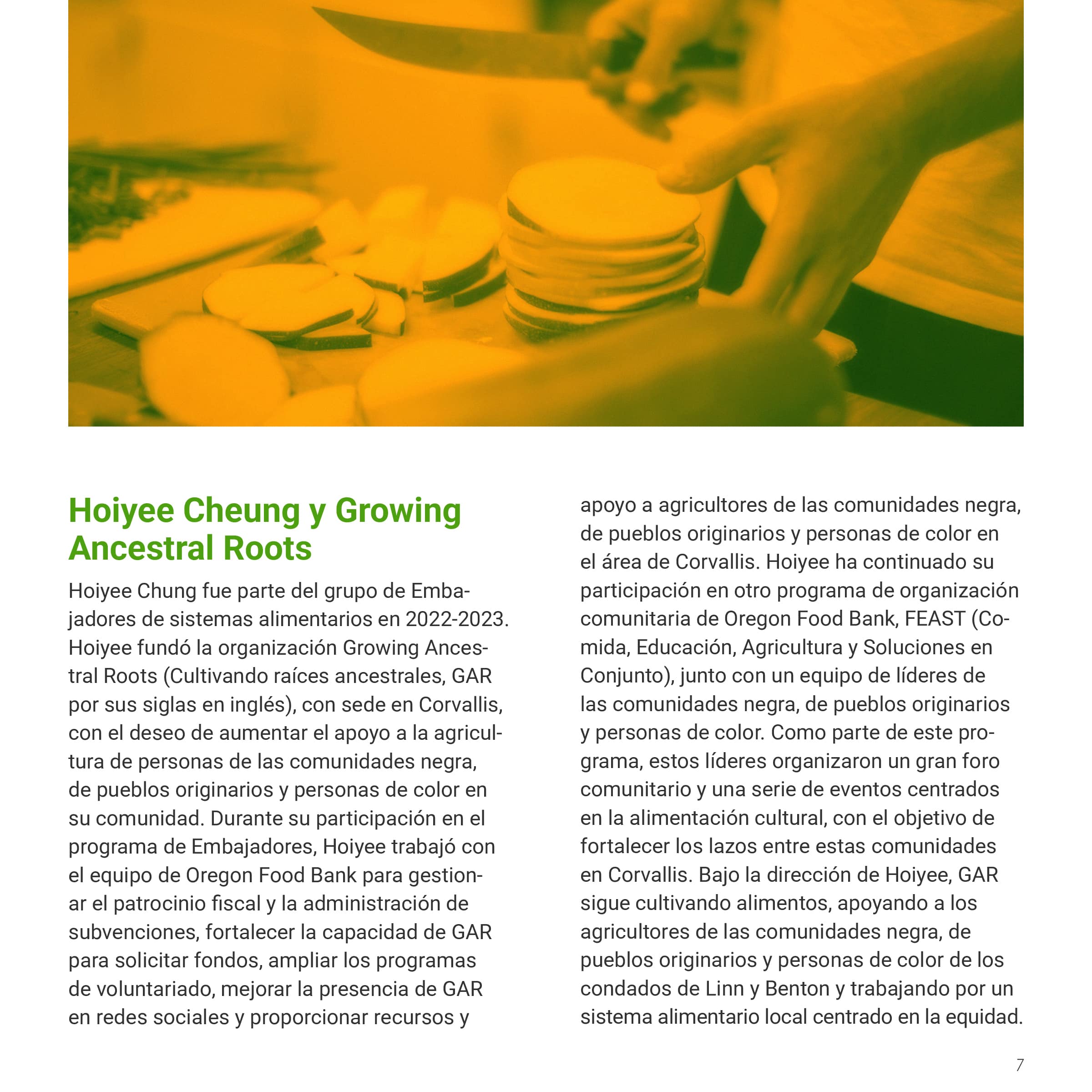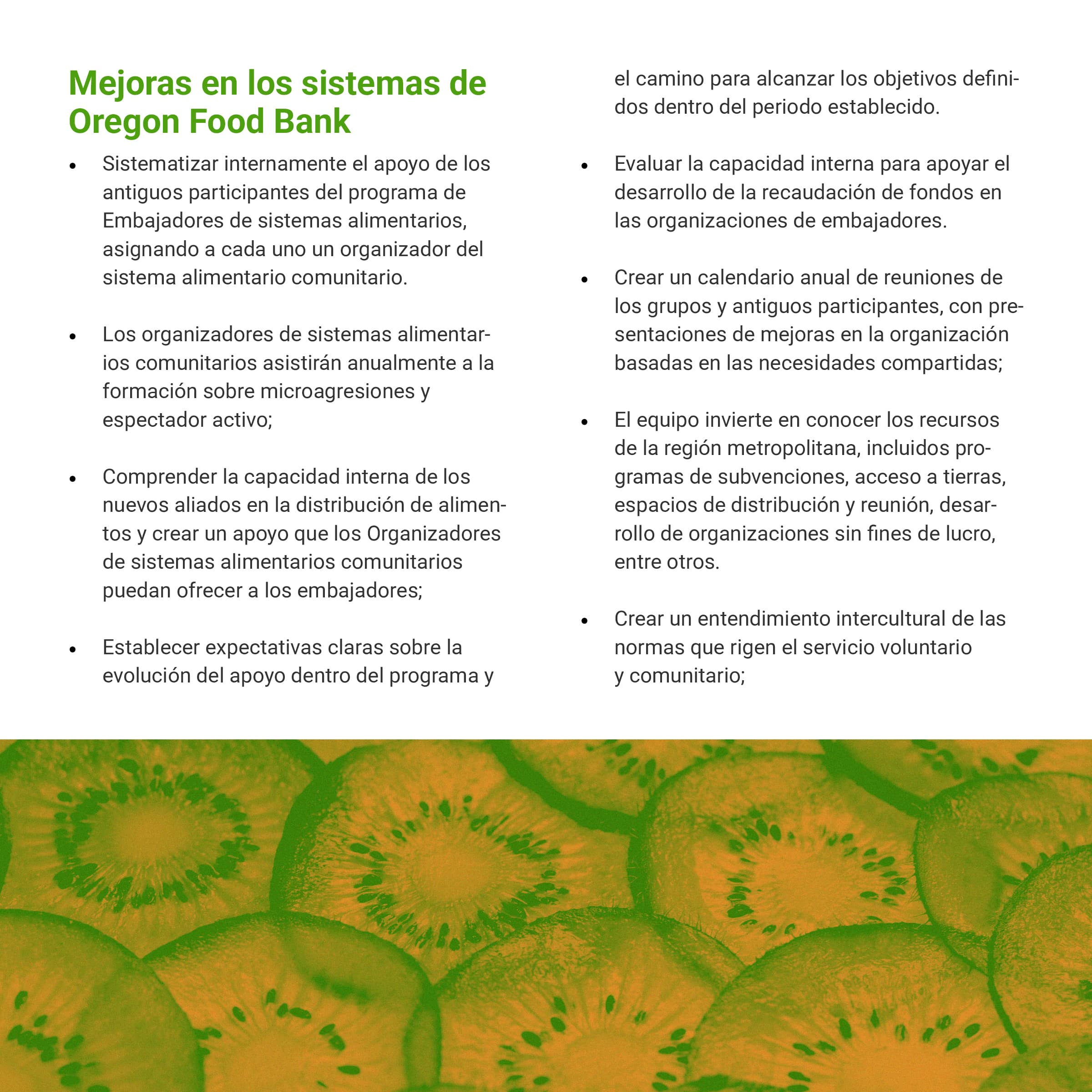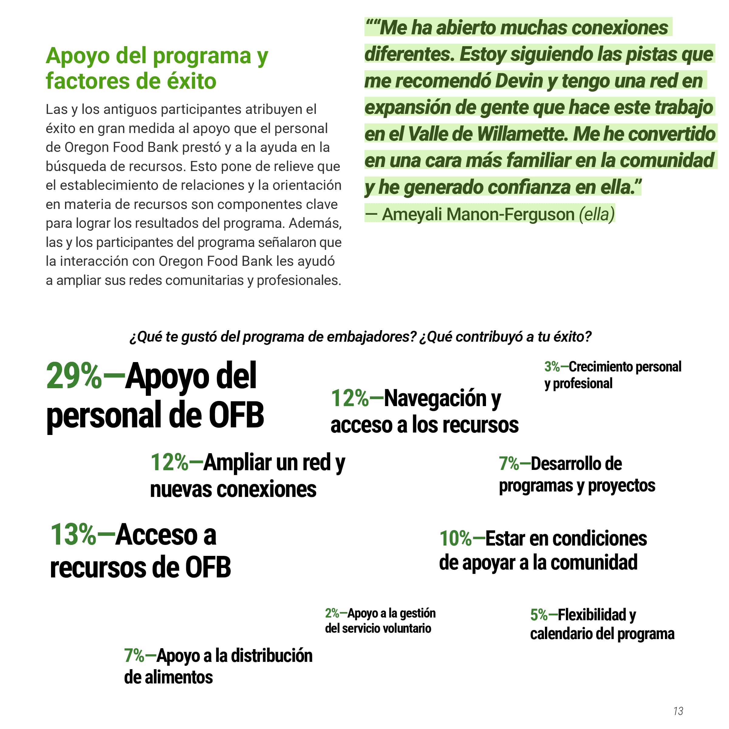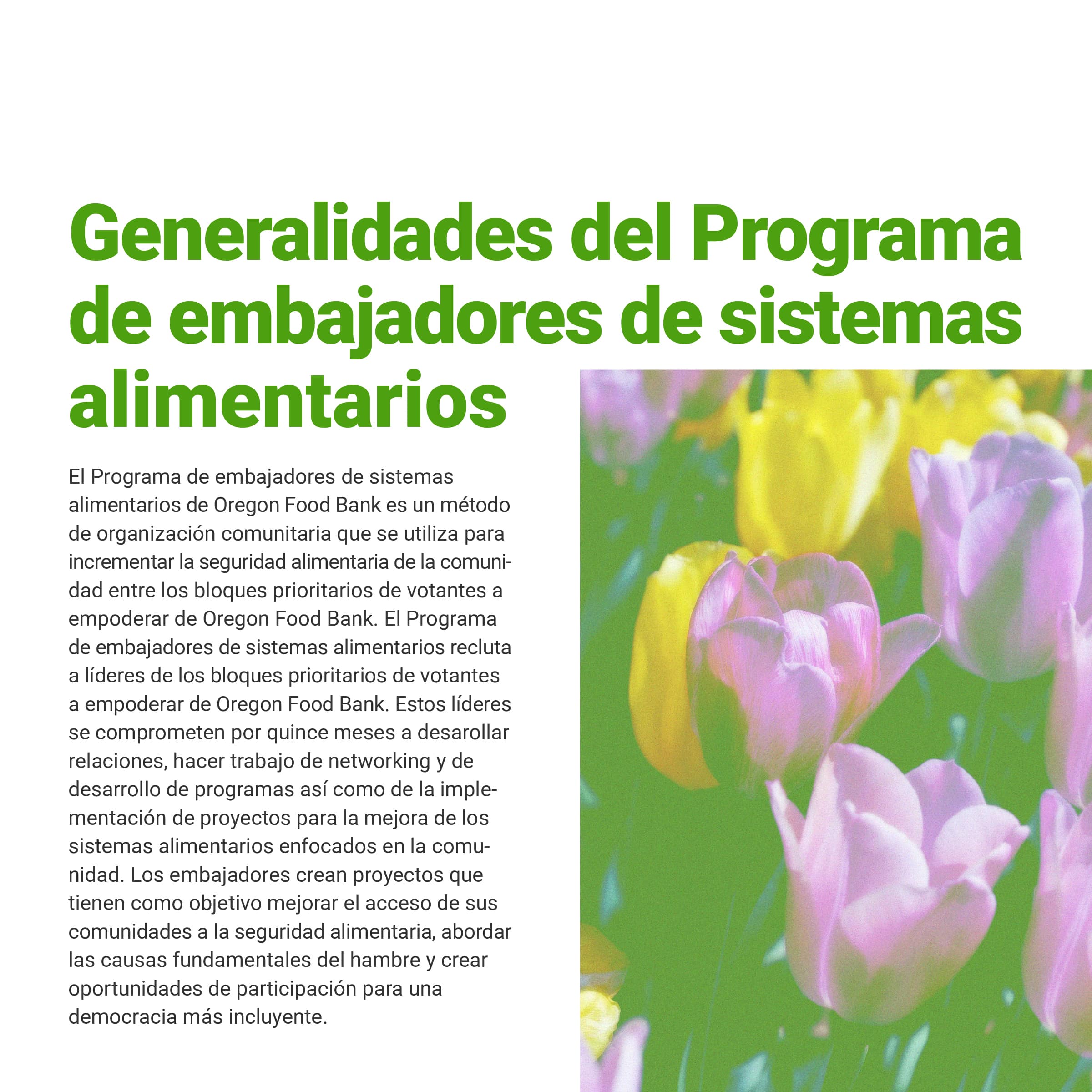 I was tasked with creating a multi-page document of the Oregon Food Bank’s Food Systems Ambassador Program, a program that helped local BIPOC residents become “ambassadors” in their community, teaching them skills to increase food security. This document would showcase both the program's successes and areas for improvement, persuading other nonprofits to implement similar community-serving initiatives. The document needed to be produced in both English and Spanish while maintaining their established brand identity. I was also asked to design graphs and charts to communicate data collected from the ambassador’s feedback.